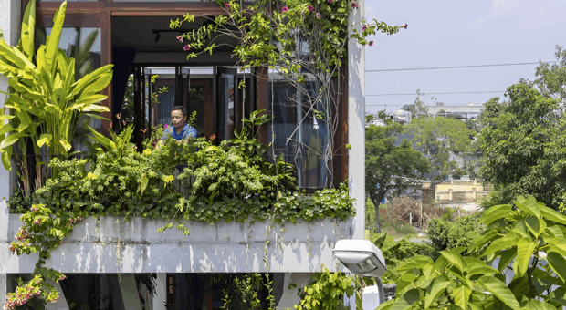 A fachada da casa se destaca com linhas retas e mistura de materiais, como pedra e madeira. Um grande gramado contorna parte da mansão. A entrada principal da casa é marcada por uma pequena marquise, e a garagem fica oculta por um portão metálico.