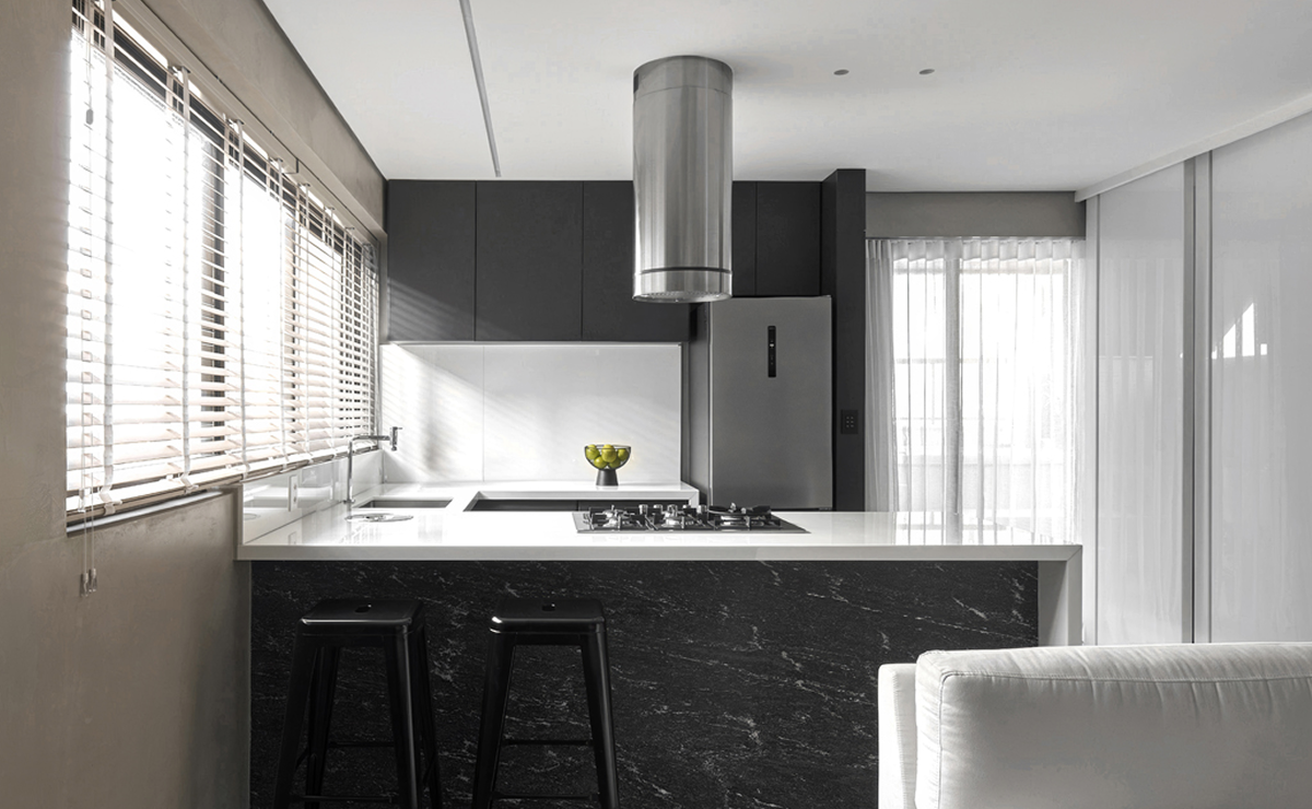Neste ambiente, é comum visualizarmos a presença da cor branca mais forte do que a preta. Este efeito ocorre pela sensação de limpeza proporcionada pelo tom. Aqui o preto aparece tímido, apenas nos detalhes dos eletrodomésticos. Complementando a decoração, as bancadas em cinza atribuem neutralidade ao cômodo.