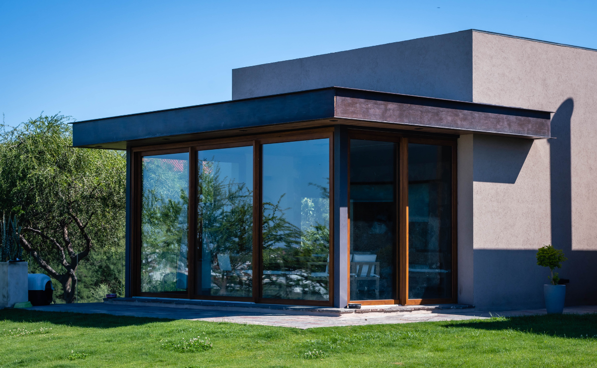 A casa geométrica recebeu paredes de vidro em todas as fachadas e ficou ainda mais estilosa e moderna.
